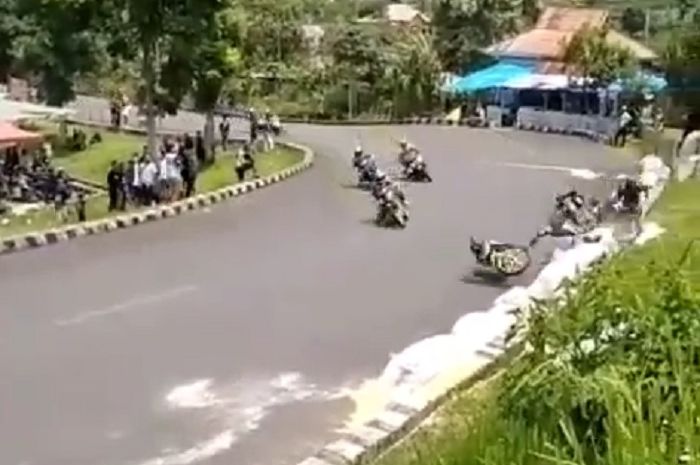 Insiden senggolan berujung kecelakaan kembali terjadi di arena balap motor.