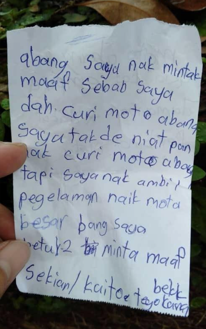 Bang, aku ingin minta maaf karena mencuri sepeda motormu.