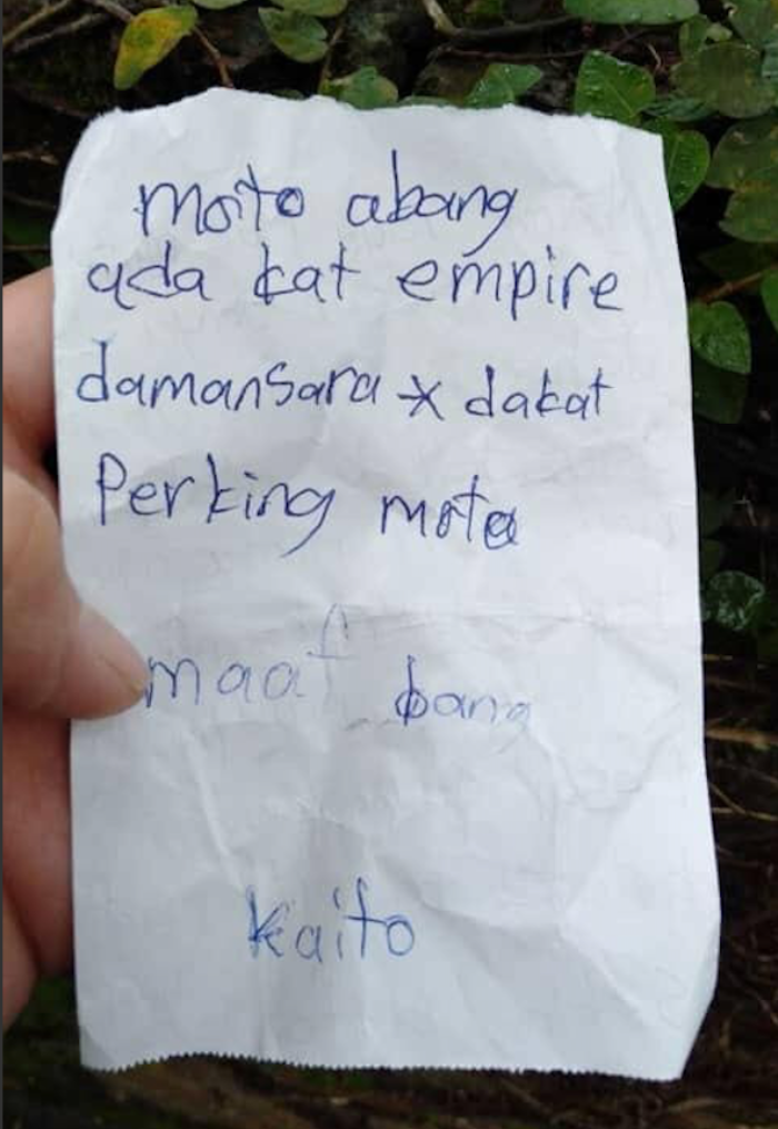 Dalam surat itu, pencuri juga mengatakan kalau motor itu ada di tempat parkir sepeda motor Empire Damansara.