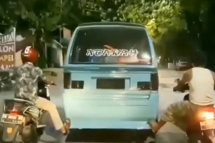 Pada video terlihat dua orang pemotor Yamaha NMAX dan Mio yang sedang mendorong angkot menggunakan kakinya.