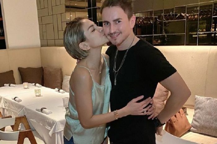 Jorge Lorenzo pun tampak tersenyum saat nyai menciumnya.