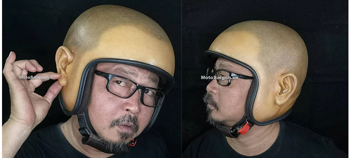 Helm ini enggak hanya berbentuk kepala plontos saja, namun di kedua sisinya juga dilengkapi telinga layaknya kepala manusia.