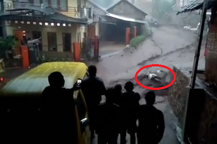 Karena air bah yang turun cukup deras, sejumlah sepeda motor yang melintas tergelincir di lokasi kejadian.