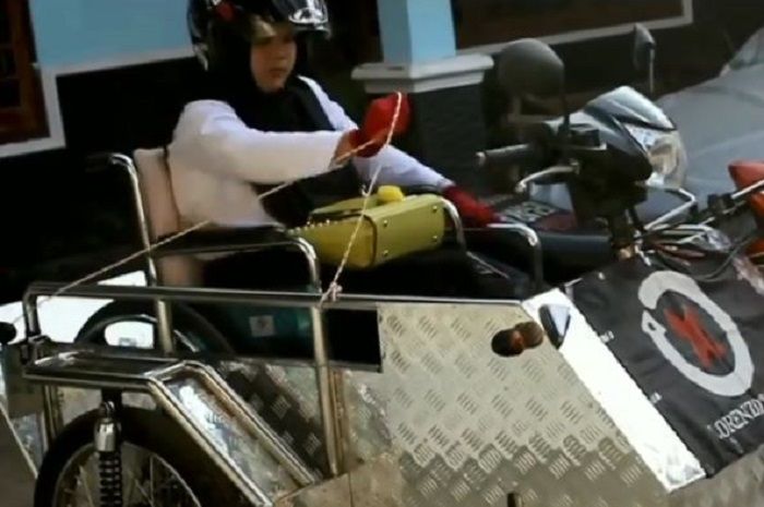 Gerobak itu berfungsi sebagai pengganti tempat duduknya lantaran ia beraktivitas di kursi roda.