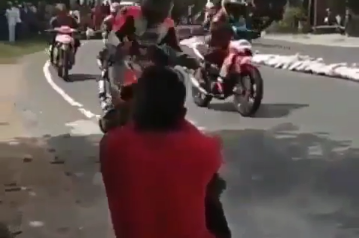 Di video pun terlihat, beberapa kali penonton berbaju merah tersebut hampir tersambar oleh motor pembalap yang sedang melaju.