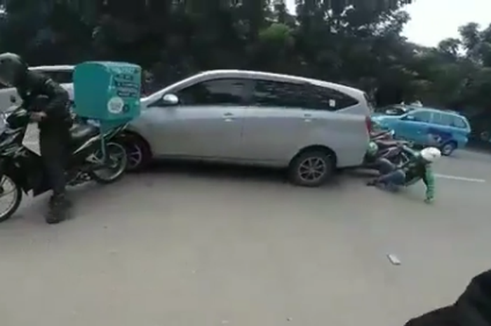 Nahas di belakang mobil, ada dua pengendara motor yang juga telat mengerem sehingga menabrak mobil.