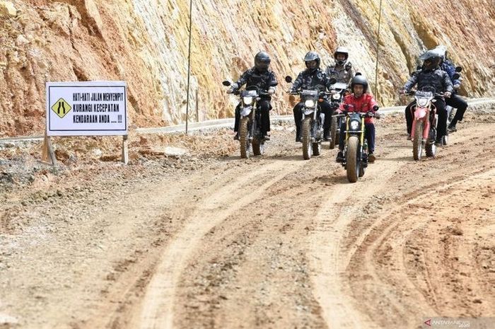 Gridmotor.id - Presiden Joko Widodo naik motor kustom Kawasaki W175 meninjau pembangunan jalan di Kabupaten Nunukan, Kalimantan Utara, Kamis (19/12/2019).