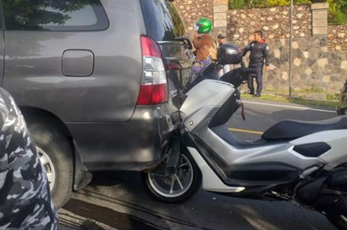 Terlihat pada foto tersebut, motor Yamaha NMAX menabrak bemper belakang mobil Toyota Kijang Innova.