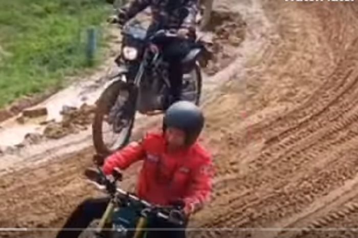 Dalam video yang diunggah akun youtube 'jabs enamblast', terekam detik-detik roda belakang Kawasaki W175 bergaya chopper milik Presiden Jokowi selip dan terpeleset.