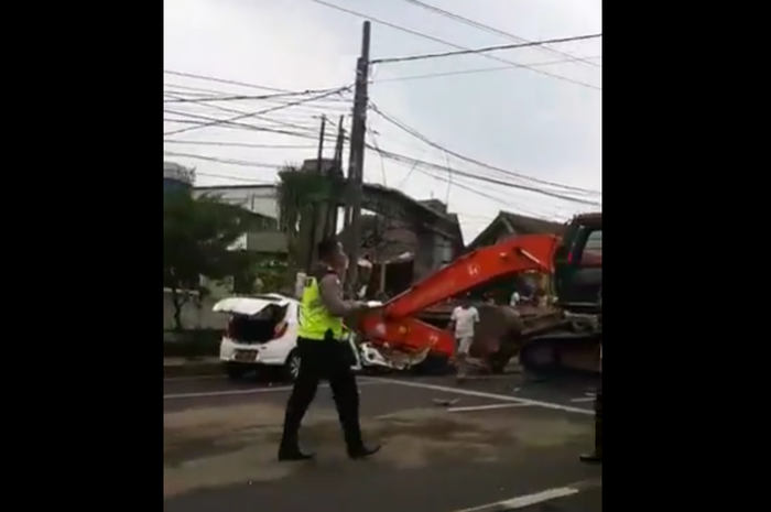 Setelah itu alat berat yang dimuat truk pun terjatuh dan menimpa dua mobil lain yang melaju dari arah berlawanan.