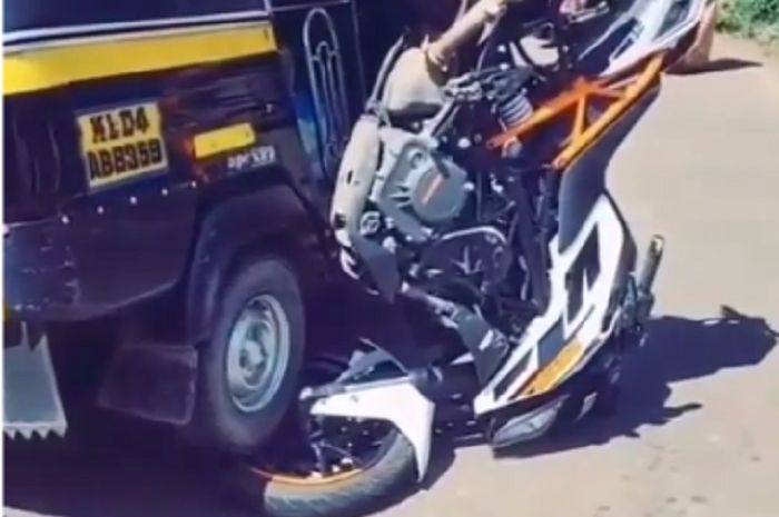 Video yang diunggah di akun Instagram @agoez_bandz4, sebuah motor jenis KTM Duke 250 ringsek dilindas bajaj.