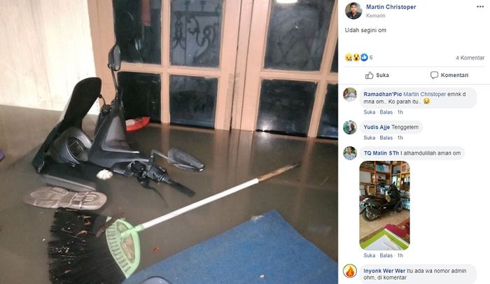 Dilihat dari fotonya, banjir yang terjadi di Bekasi nampak tinggi, hanya helm yang selamat dan enggak basah.