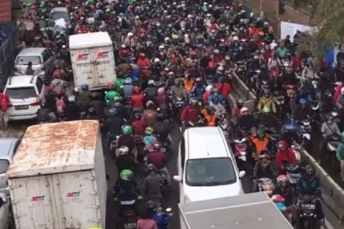 Ratusan pemotor dan mobil berjejalan di sepanjang jalan Daan Mogot Jakarta Barat.