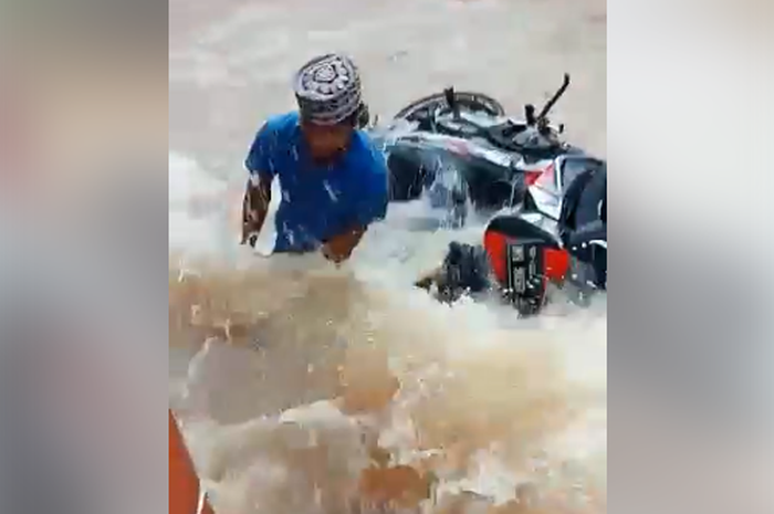 Ombak yang besar itu pun langsung menghempaskan pengendara Honda Supra sampai terjatuh.