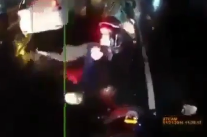 Pada video terlihat seorang boncenger motor yang sedang menggunakan jas hujan model ponco tiba-tiba salto dan terlempar dari motor.