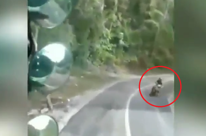 Dikutip GridMotor dari akun Instagram @dashcam_owners_indonesia, pemotor terjatuh saat berpapasan dengan truk.
