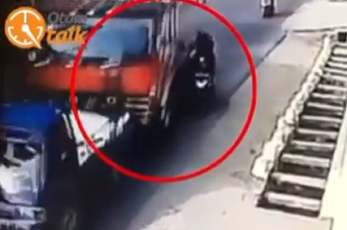Terlihat pada video, truk hampir menyenggol pemotor sebelum menabrak mobil pikap.
