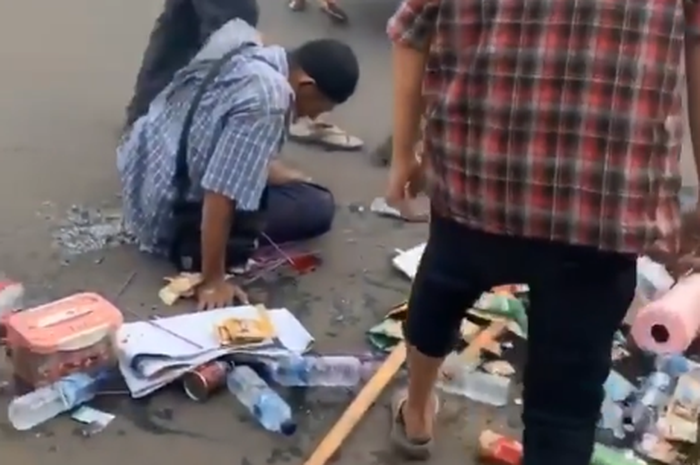 Terlihat dagangan penjual minuman tersebut sampai tumpah berantakan di jalanan.