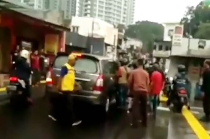 Kawasan Kemang, Jakarta Selatan mendadak mencekam karena sopir Kijang Innova berusaha kabur dan dikejar puluhan pemotor dan driver ojol.