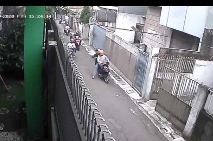 Seseorang turun dari motor dan terlihat mengarahkan benda yang diduga senjata tajam ke arah pengguna jalan yang melintasi jalan itu.
