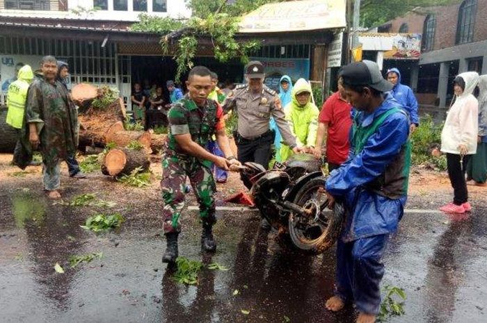 "Kita melakukan pembersihan pohon yang tumbang bersama petugas Dinas Lingkungan Hidup dan rekan dari Babinsa dengan menggunakan mesin alat pemotong otomatis, dan mengevakuasi motor yang tertimpa pohon," terang Suwandhi.