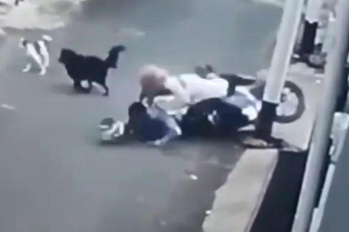 Setelah terjatuh, pengendara motor langsung bangun dan mencoba menimpuk anjing yang mengejarnya bersama warga sekitar.