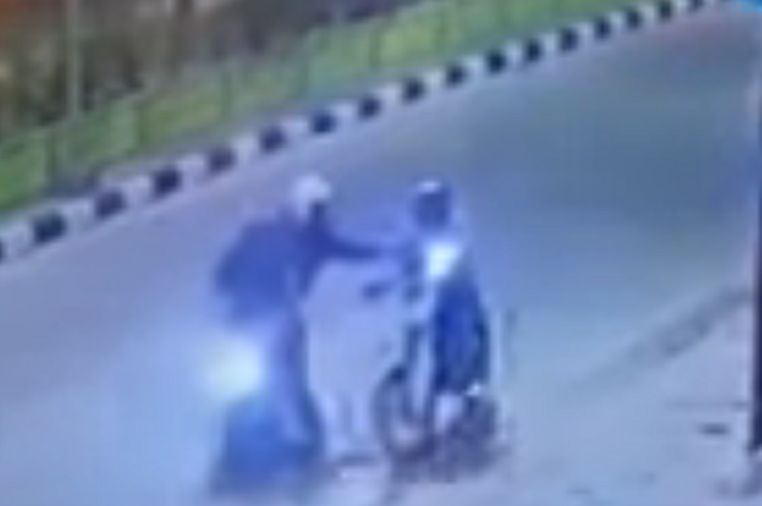 Aksi begal pengendara motor trail itu terekam kamera CCTV, dan videonya viral di sosial media.