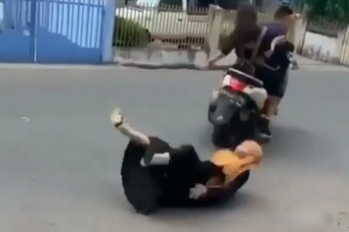 Diduga, pemotor yang memboncengnya terlalu kencang dalam memulai gas saat keluar gang.