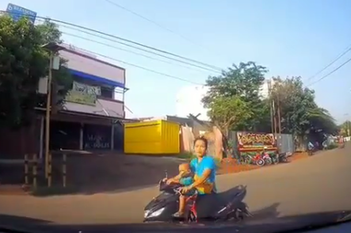 Tapi tiba-tiba dari arah berlawanan datang seorang emak-emak yang mengendarai motor sambil membonceng anaknya di depan.