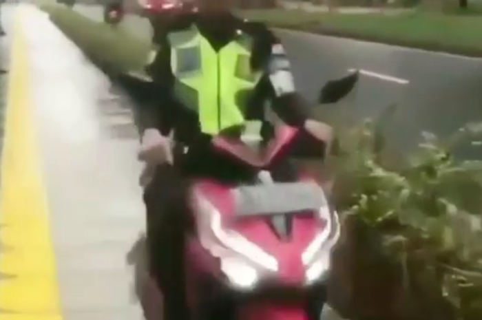 Terlihat pemotor Honda Vario yang saat itu melawan arah di sebuah trotoar jalan.