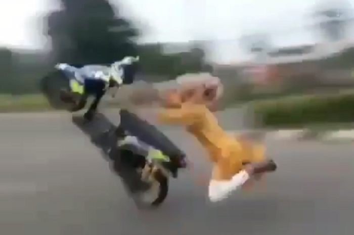 Namun karena terlalu banyak menekan rem belakang, si ukhti ini malah akhirnya terjatuh.