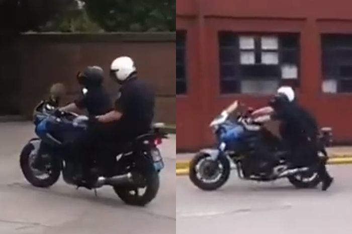 Mereka sedang berlatih manuver berganti rider, jadi pengendara di depan bertukas posisi dengan yang dibonceng.