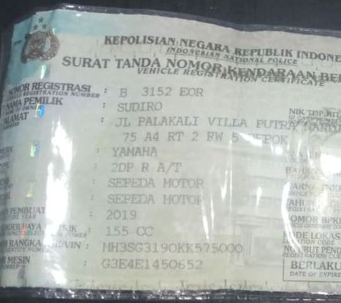 Juga Sudiro Alphareza menunjukkan foto STNK dan namanya Sudiro serta pelat nomor di STNK sama dengan di motornya.