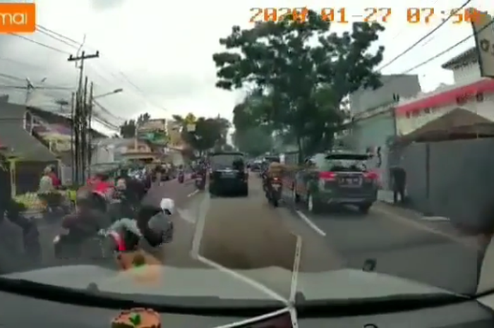 Motor tersebut diduga terjatuh karena motor lain di sebelahnya mengerem dan mengambil jalur ke kanan secara mendadak.