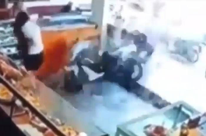 Otomatis motor langsung meloncat dan menabrak pintu kaca toko kue sampai pecah.