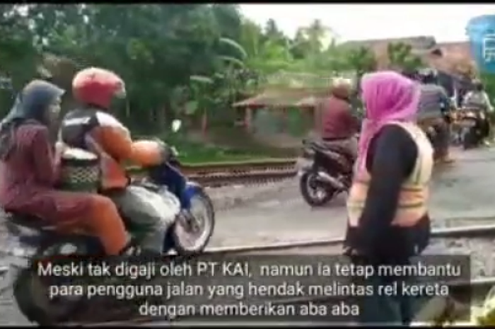 Terlihat di video yang viral, Kasturah menggunakan rompi berwarna cerah dan memberi info kepada pengguna jalan saat ada kereta yang ingin lewat.