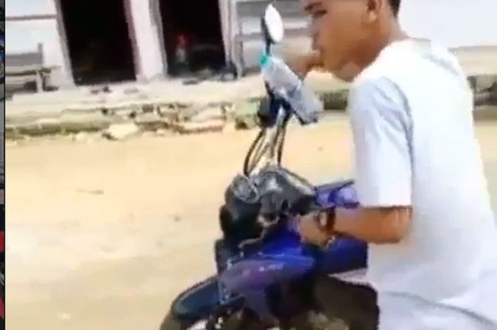 Pria tersebut bukannya duduk di atas motor, melainkan berdiri di sampingnya sambil mencoba kopling di motor.