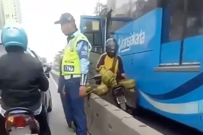 Saat ditanya oleh salah satu petugasnya, pengendara motor tersebut memasuki jalur busway lantaran menghindar dari operasi kepolisian atau razia.