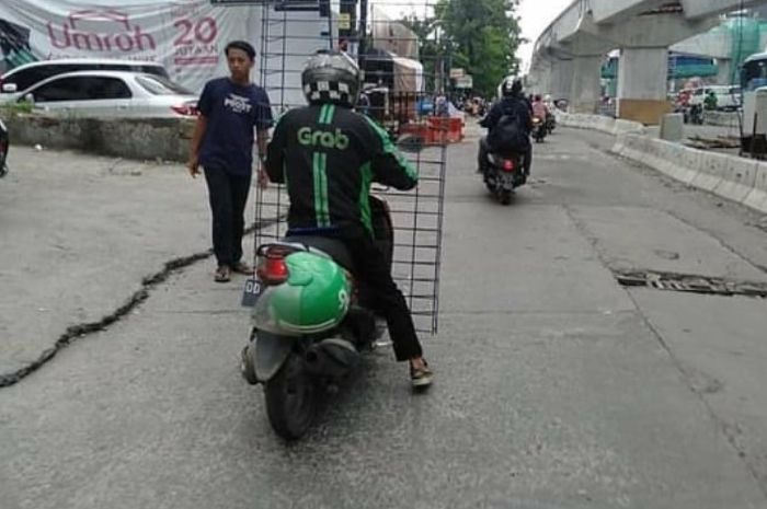 Seorang driver ojek online membawa penumpang, bukan manusia melainkan sebuah pagar besi berukuran cukup tinggi.