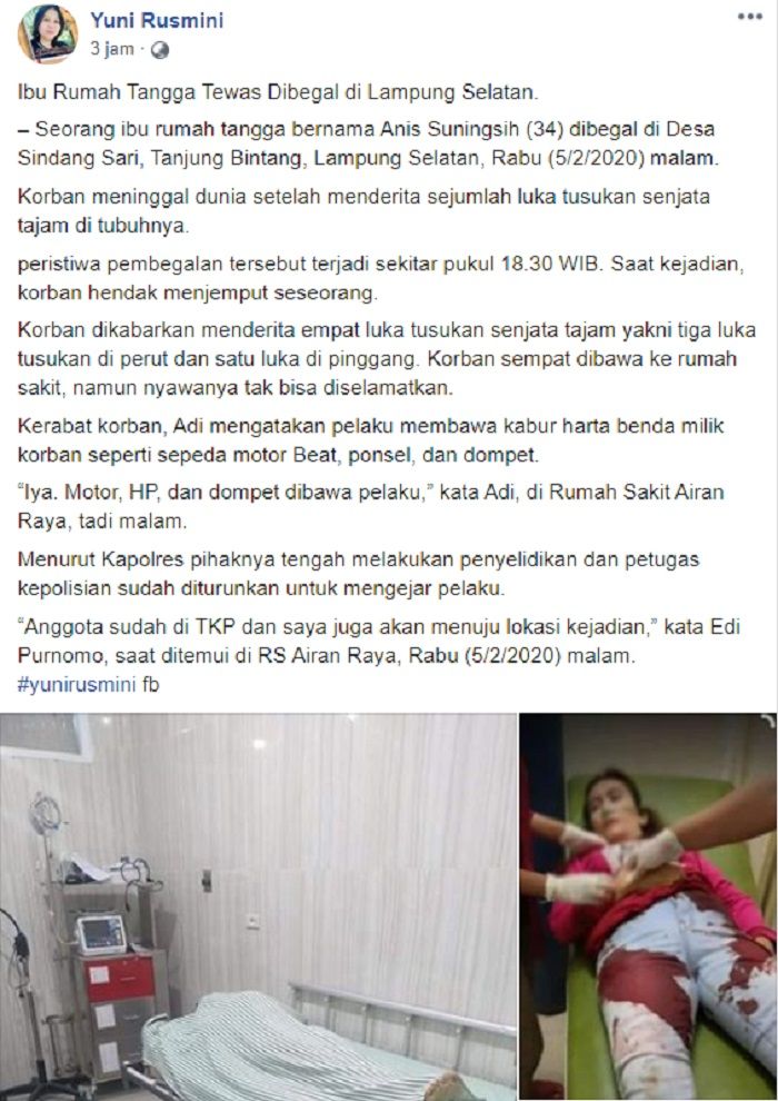 Dari informasi yang posting FB Yuni Rusmini, korban diketahui akan menjemput seseorang.
