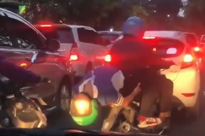 Terlih dari rekaman mobil, selagi menunggu kemacetan sang penumpang terlihat berolahraga diatas motor.