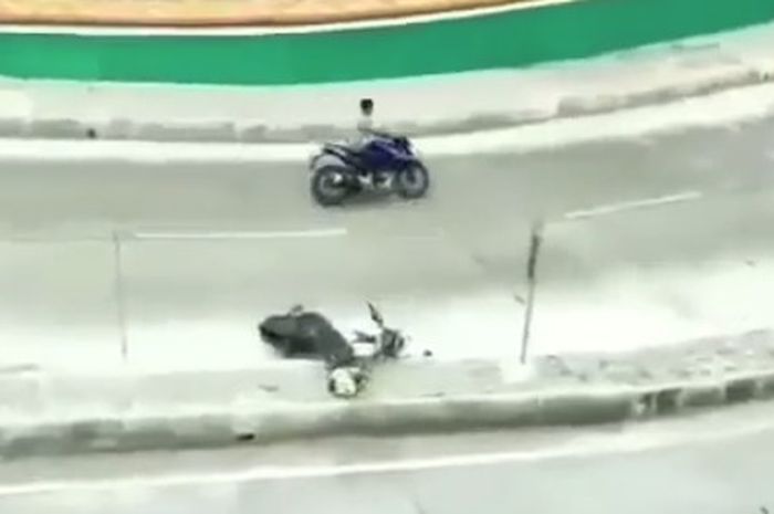Terlihat dari kejauhan pengendara Yamaha Byson melaju, saat jalan berbelok tiba-tiba motor pun oleng.