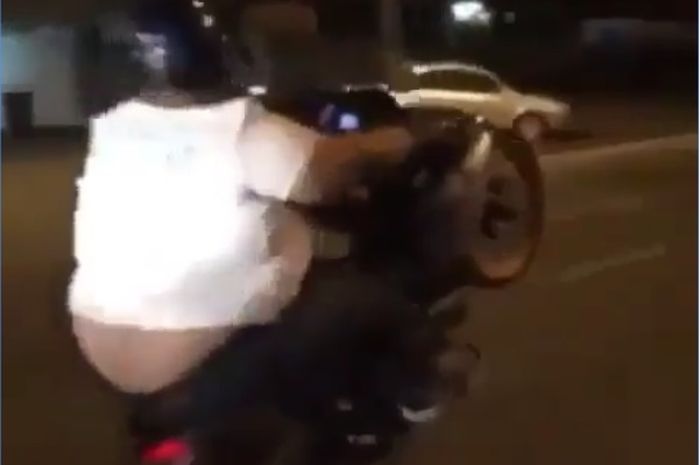 Aksi Wheelie (mengangkat roda depan) pada saat motor berjalan dilakukan oleh pria berbadan subur ini.