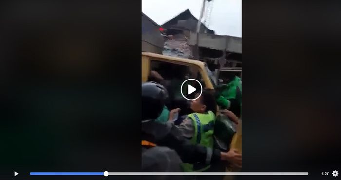 Beberapa dagangan ikut roboh diterjang si sopir yang terus dihujami pukulan dan tendangan.