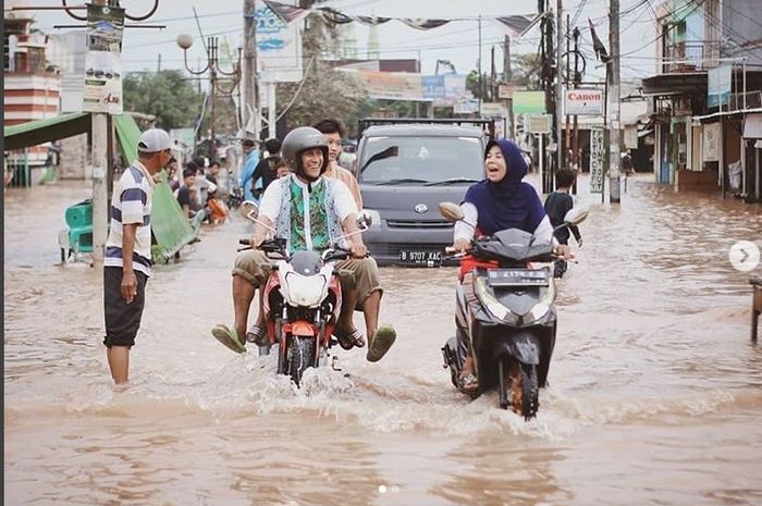 Terlihat dua pengendara motor sedang berusaha melewati jalanan yang banjir dan lumayan tinggi.