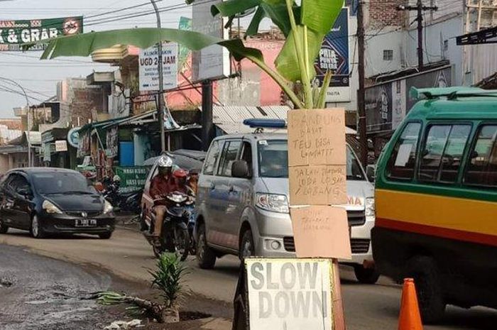 Gridmotor.id - Jalan Raya Cihampelas-Cililin, Kabupaten Bandung Barat, Jawa Barat, ditanami pohon pisang karena banyak motor yang terjatuh akibat lubang besar.