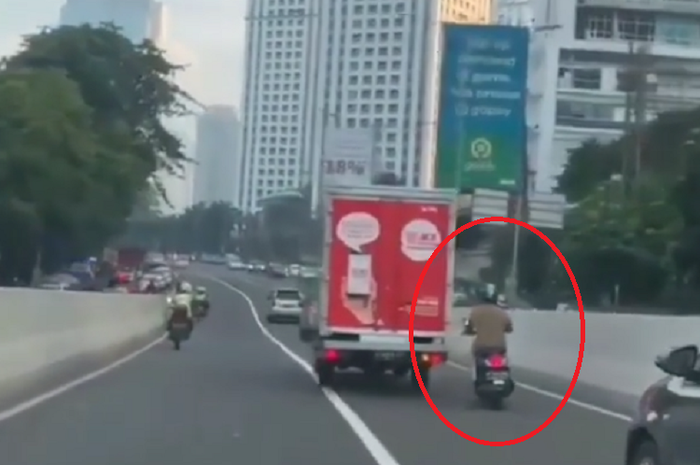 Untuk menghindari teguran polisi, pemotor melaju persisi di belakang sebuah mobil box.