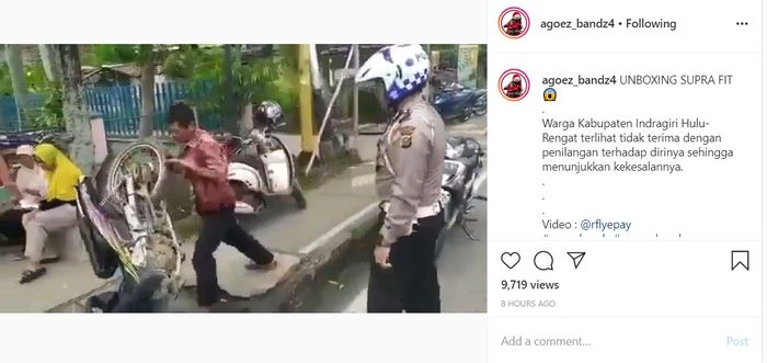 Terlihat bapak berbaju batik ini mengangkat dan membanting berulang kali Honda Supra Fit miliknya di depan polisi.