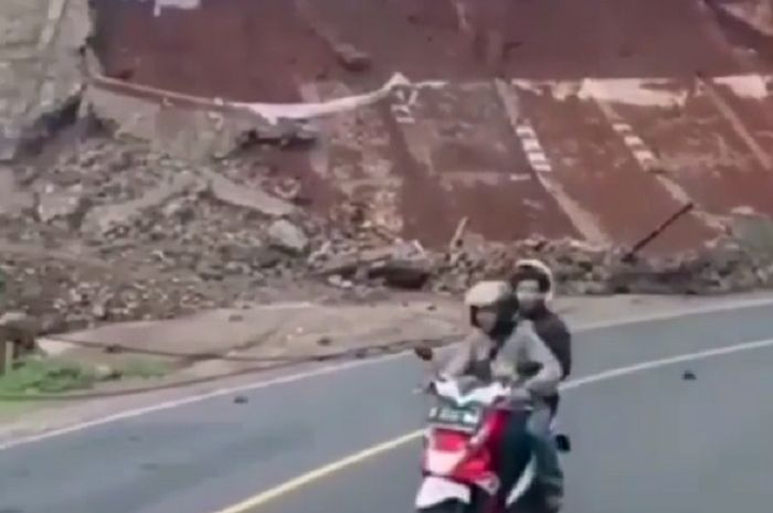 Dari video yang diunggah akun Instagram @fakta.indo, tebing langsung retak dan roboh hingga tanah nyaris menutup jalanan.