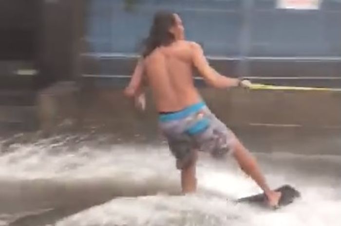 Pria yang tinggal di Bintaro Tangerang Selatan ini posting video pria berambut gondrong bermain selancar di jalanan yang banjir.